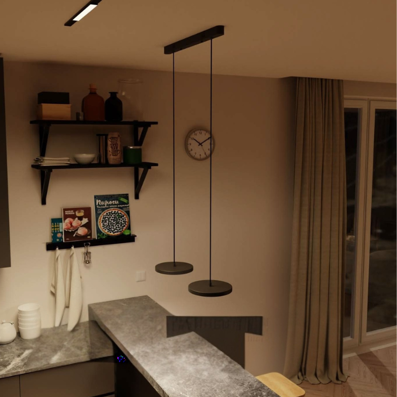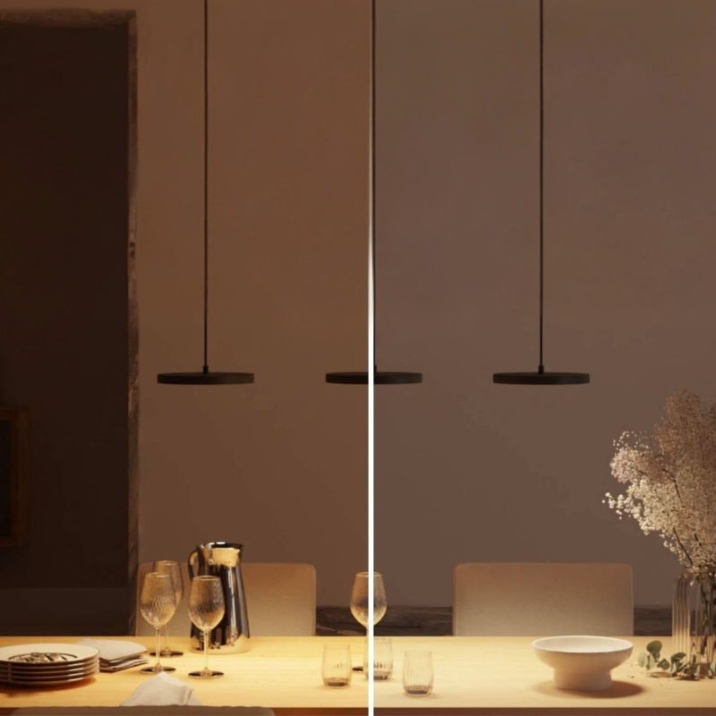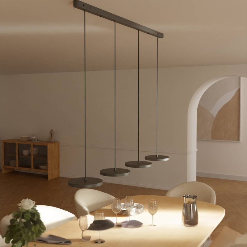 Diese Pendelleuchte besticht durch eine lineare Anordnung flacher, scheibenförmiger Lichtköpfe, die an verstellbaren Kabeln hängen. Sie sorgt für eine gleichmäßige, nach unten gerichtete Beleuchtung und fügt sich mit ihrem modernen, minimalistischen Design harmonisch in Esszimmer, Wohnräume oder Büros ein. Die Höhe jeder Scheibe kann individuell angepasst werden, um unterschiedlichen Raumhöhen oder Gestaltungswünschen gerecht zu werden.