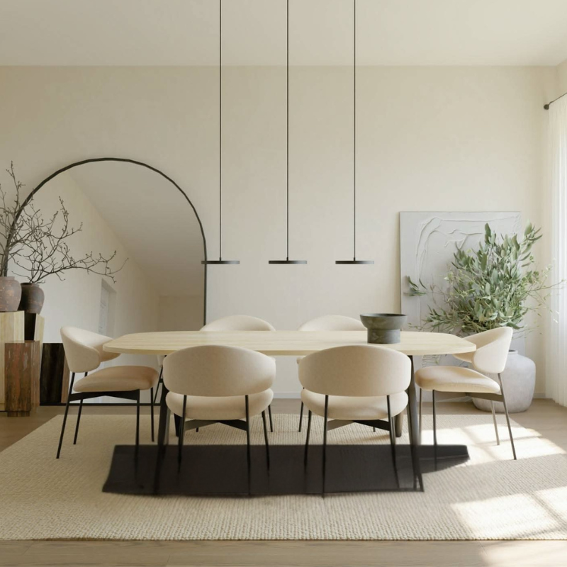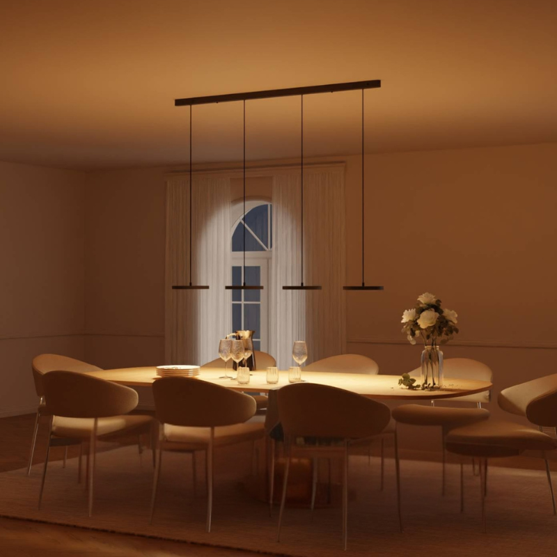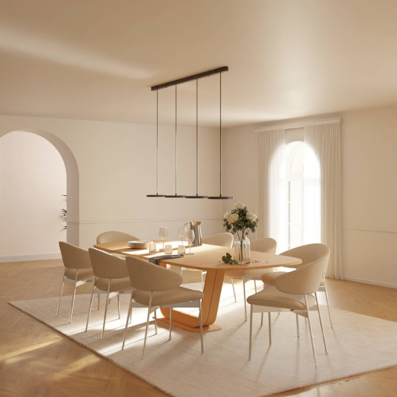 Über einem rechteckigen Esstisch oder Konferenztisch installieren, um eine gleichmäßige, nach unten gerichtete Beleuchtung und ein elegantes, modernes Raumgefühl zu schaffen.