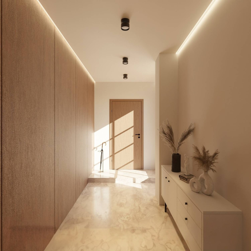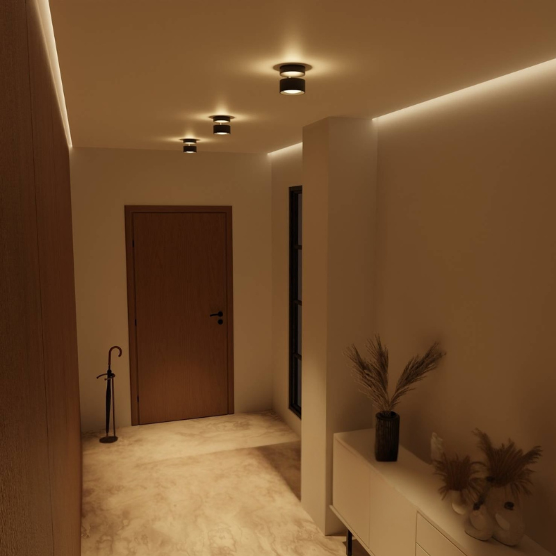 Mehrere Leuchten in einer Reihe entlang von Fluren oder Eingangsbereichen installieren, um eine gleichmäßige Lichtwirkung zu erzielen, die minimalistische und zeitgenössische Innenräume stilvoll ergänzt.