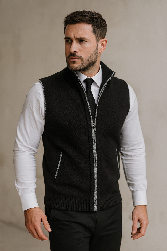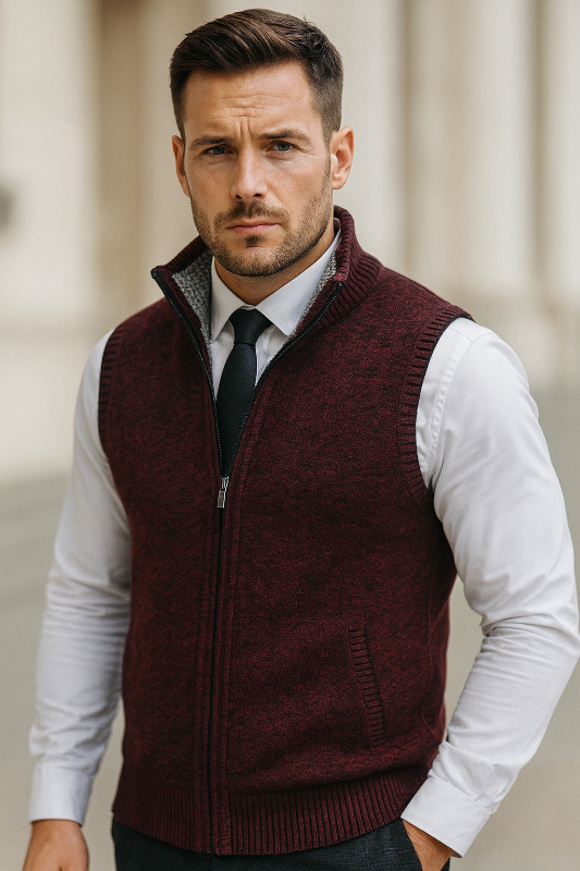 Dit herenvest kenmerkt zich door een smalle, strakke snit met klassiek revers en subtiel gestructureerd oppervlak. Het mouwloze ontwerp biedt veelzijdigheid, terwijl de strakke lijnen de elegante vorm benadrukken. Geschikt voor kantoor, vrije tijd of formele gelegenheden in de overgangsseizoenen.